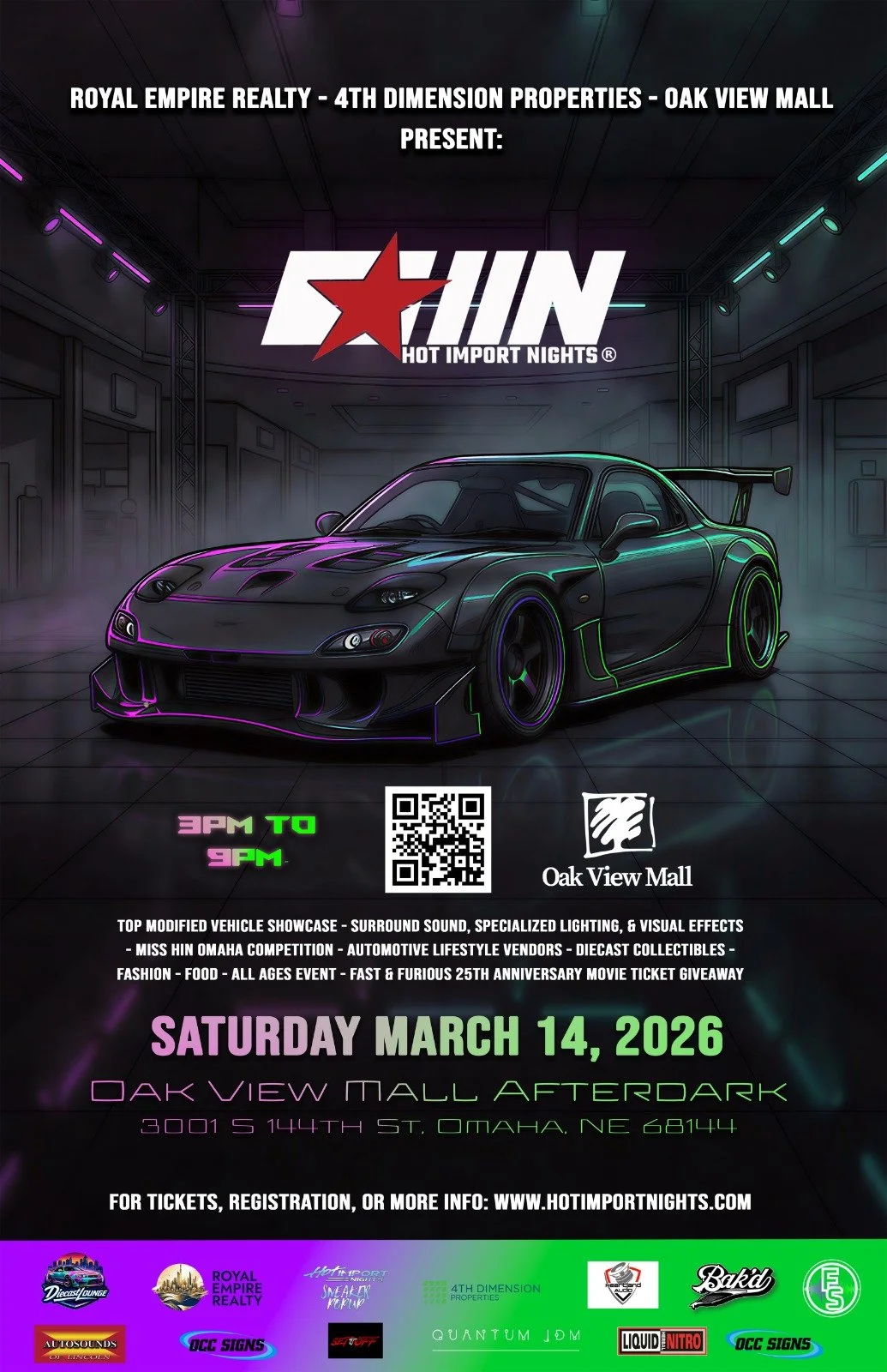 Hot Import Nights brings the ultimate indoor automotive culture experience to Omaha with Oak View Mall AFTERDARK Experience — The Official HIN Season Opener. Join us Saturday, March 14th (3PM–9PM) for an unforgettable evening of cars, music, lifestyle vendors, fashion, art, and entertainment in a climate-controlled indoor setting perfect for all ages. One night only — grab tickets early and be part of the festivities.