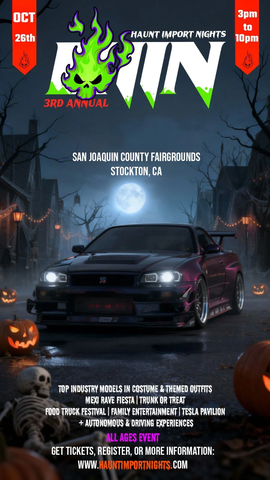 This Sunday, October 26, 2025 (3pm to 10pm), Haunt Import Nights returns to the San Joaquin County Fairgrounds for its third annual NorCal takeover—and this is no ordinary car show. Step into a full-scale festival production with dazzling light shows, immersive scare zones, high-energy family entertainment, and an EDM Festival Stage featuring DEORRO (w/ ticket upgrade) that will keep the night alive. Stroll through a massive car show with hundreds of the hottest rides, explore a vibrant night market packed with food, fashion, and festival fun, and experience the electric atmosphere that only Haunt Import Nights delivers.